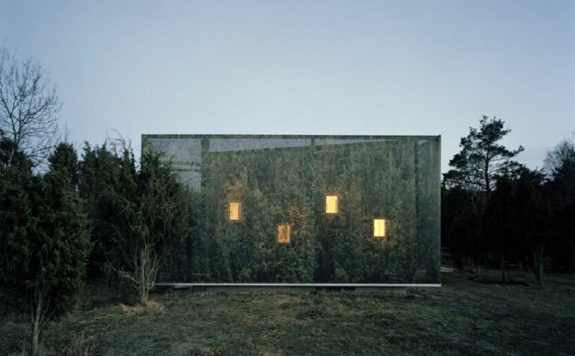 Designed by Swedish architects Hans Murman and Ulla Alberts, the Juniper House becomes barely visible, mirroring its surroundings with its facade. The facade is a playful comment on allowing modern architecture to be visual in the landscape. The house design allows for experiencing color, texture, surface, material, transparency and light on and through the facade. A photo of the existing junipers was used as the base for the tailor-made cloth that is 35 metres wide and three metres high and draped over three sides of the house. The netted vinyl cloth is on a galvanized steel construction at about 40 centimeters away from the facade. The resulting building becomes almost invisible and suddenly materialises and dematerialises depending on weather conditions and angle of view. This type of architecture can be interpreted as a more complex post-modern dialogue with context and history. Furthermore, it questions the nature, role and impact of architecture. Creating optical dematerialisation effects is part of the interchange with context and beholder. It is, however, also a will to be invisible, architecture of invisibility and transparency, ephemeral architecture in a sense, whichdisappears with the blink of an eye.
